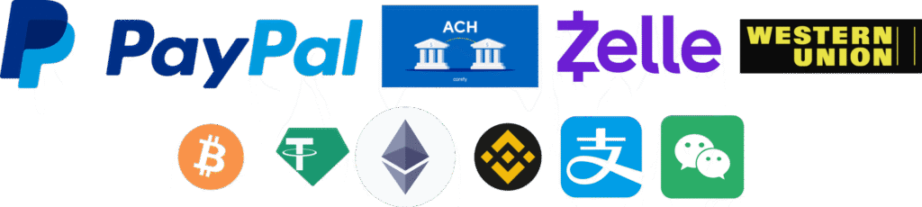 We can accept most payment methods on the market, including wire transfer, Bitcoin, USDT, virtual digital currency, Western Union, Zelle, Ach, Paypal, Alipay, WeChat, etc.