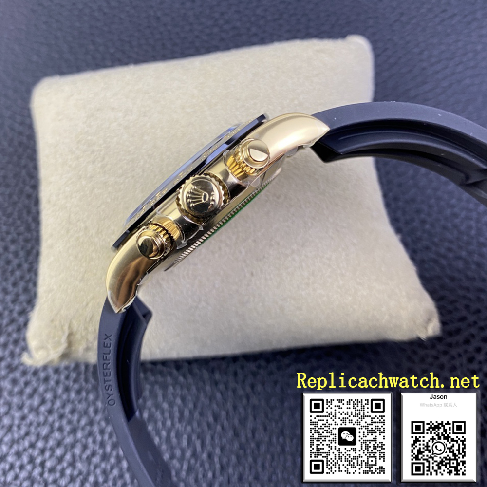 يكمن جوهر تصميمها في العلبة المتينة بقطر 40 مم المصنوعة بالكامل من الذهب الأصفر الخالص عيار 18 قيراطًا والتي تمنح إحساسًا كبيرًا وفاخرًا. زُوّد الإطار الثابت بإدخال سيراميك سيراكروم أسود من السيراميك الذي يحتوي على مقياس التاكيمتر، مما يوفر مقاومة استثنائية للخدش وتناسقًا مثاليًا مع الميناء. الميناء نفسه باللون الأسود اللامع العميق، حيث يعمل كخلفية دراماتيكية لثلاثة موانئ فرعية ذهبية اللون عند الساعة 3 و6 و9. ويضمن هذا التصميم "الباندا العكسي"، إلى جانب علامات الساعات والعقارب الذهبية كرومالايت، وضوحًا استثنائيًا ومظهرًا متماسكًا فريدًا.