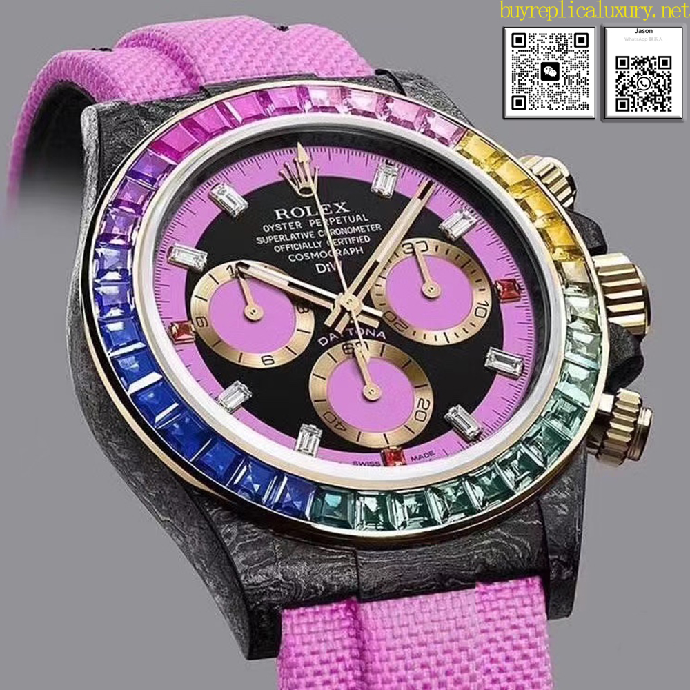يكمن نجاح مدي قوس قزح في ترصيع الأحجار الكريمة الذي لا تشوبه شائبة. ويتطلّب الحصول على الأحجار الكريمة وقطعها وترتيبها بألوان وأحجام متدرجة بشكل مثالي عملاً وجهداً هائلين مما يمثل أفضل عرض لحرفية مجوهرات رولكس. تتخطى ساعة دايتونا ذات إطار قوس قزح عالم الكرونوغراف؛ فهي قطعة مجوهرات وفن بارز، ورمز للثراء والذوق الاستثنائي. اشترِ ساعات رولكس الوردية المقلدة، رولكس رينبو سيركل دايتونا.