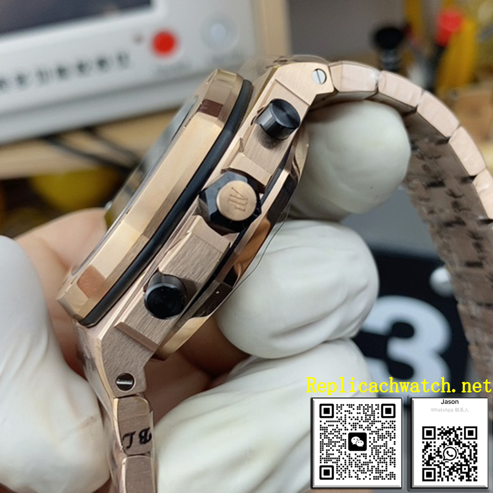 The brown dial with Arabic numerals creates a warm, sophisticated aesthetic that distinguishes this timepiece from other Offshore models. The large Arabic numerals enhance legibility while adding a distinctive character to the dial layout, complemented by the rose gold applied markers and hands. The chronograph sub-dials in contrasting shades maintain perfect readability, and the date window at 3 o’clock integrates seamlessly into the overall design. The “Méga Tapisserie” pattern provides texture and depth, creating a captivating play of light from every angle. Buy Replica Audemars Piguet Offshore Chronograph Rose Gold 42mm Brown Arabic Dial. Copy Audemars Piguet Offshore Chronograph Rose Gold with Fluted Bezel on Jubilee online.