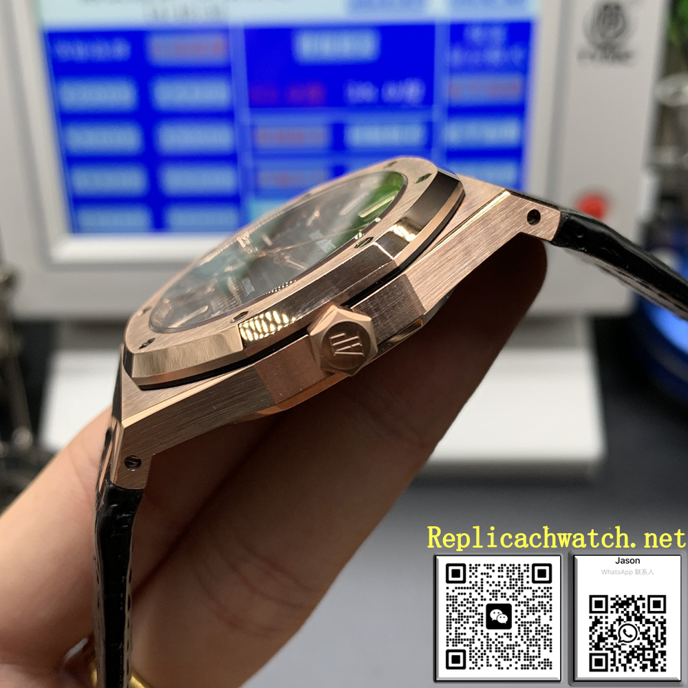 The Royal Oak 15400 preserves all the collection’s legendary design codes while offering perfect proportions for modern wearers. The silver “Tapisserie” dial provides a classic backdrop that complements the warm rose gold case, while the date window at 3 o’clock maintains perfect integration with the overall design. The bracelet’s construction allows for exceptional comfort and flexibility, with each link individually crafted and finished to ensure seamless visual continuity. The folding clasp features the AP monogram and a secure double-deployment mechanism, completing the watch’s sophisticated appearance. Where to buy Audemars Piguet Replica Royal Oak 15400 Rose Gold online? Buy Audemars Piguet Replica Royal Oak online fast.