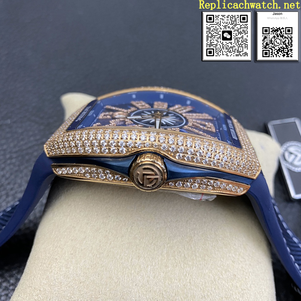 The Franck Muller Vanguard Diamond in Rose Gold is a masterful fusion of bold sports watch DNA and opulent haute joaillerie. This timepiece takes the iconic, muscular tonneau-shaped case of the Vanguard collection and reinterprets it in warm, luxurious 18k rose gold, instantly elevating its presence. The signature curved case, engineered for ergonomic comfort, provides a stunning canvas for the brilliance that follows, creating a powerful and unmistakable statement of luxury and technical prowess on the wrist. How to get a high quality Franck Muller Vanguard Diamond Horloge Roze Goud? Replica Franck Muller Vanguard Diamond Horloge Roze Goud For Sale the best quality for you.