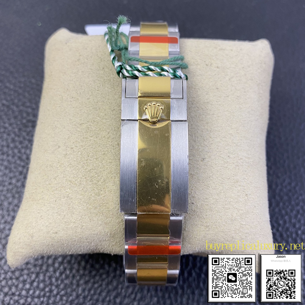 時計の全体的な構造は、クラシックなツートンカラーのデイトナのデザインを踏襲しています。ケース、リューズ、クロノグラフのプッシャーはオイスタースチールと18Kイエローゴールド製で、ベゼルとブレスレットのセンターリンクにはまばゆい輝きを放つ18Kイエローゴールドが使用されています。この素材の組み合わせは、プロフェッショナル・クロノグラフの堅牢性と実用性を保ちながら、ゴールドの使用によってラグジュアリー感を吹き込んでいます。ブラック・マザー・オブ・パールを加えることで、ゴールドの大胆さと絶妙なバランスを保ち、この時計に神秘性、エレガンス、現代性を与えている。