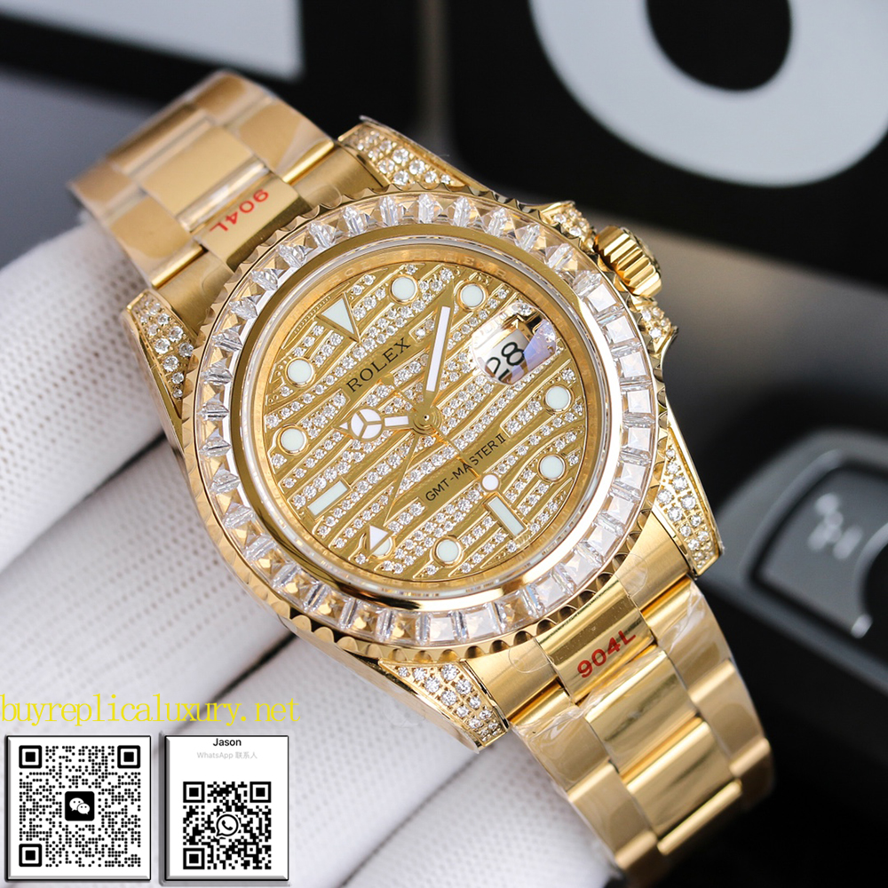 ロレックスGMTマスターII 116718ゴールドダイヤモンドは、プロフェッショナルな機能性、貴金属、ジュエリーのセッティングを極限まで追求したアイコニックな傑作である。GMTマスターのアスレチックな伝統とイブニングにふさわしい華麗さを見事に融合させている。控えめなスポーツウォッチがトレンドの中、その大胆で華やかなデザインは、コレクターズマーケットにおいて唯一無二の存在感を放ち、ロレックスの世界における真の「シャイニングスター」となっている。