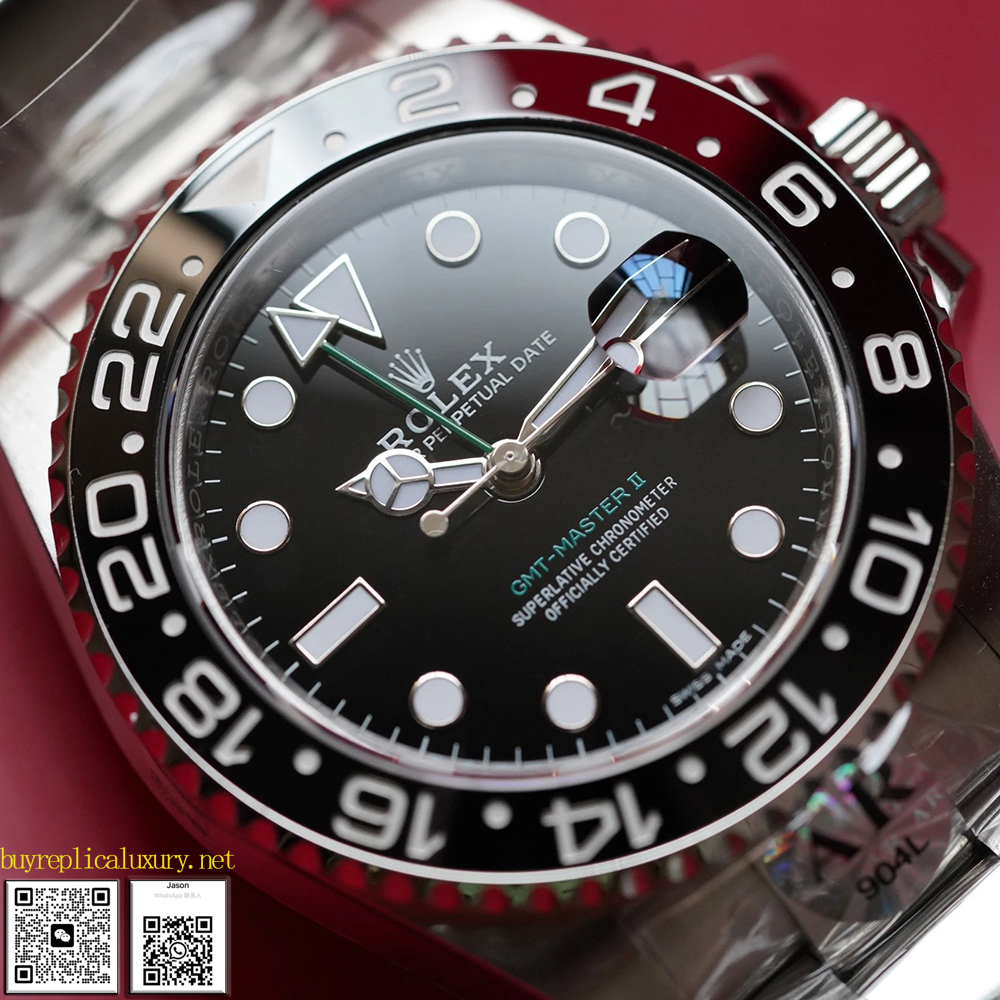 この時計の最大の特徴は、ツートーンカラーである。 ブラック&グレーのセラクロム製ベゼル.ロレックスがセラミックGMTベゼルにこの2色を組み合わせたのはこれが初めてである。ニュートラルでエレガントなトーンであるグレーをクラシックなブラックとともに使用することで、クラシックな「ペプシ」や「バットマン」よりも控えめでありながら、同様にインパクトのある単色で汎用性の高い外観を作り出している。ベゼルは傷に強く色あせないロレックスのセラミック製で、数字と目盛りは精密に成形されプラチナでコーティングされている。