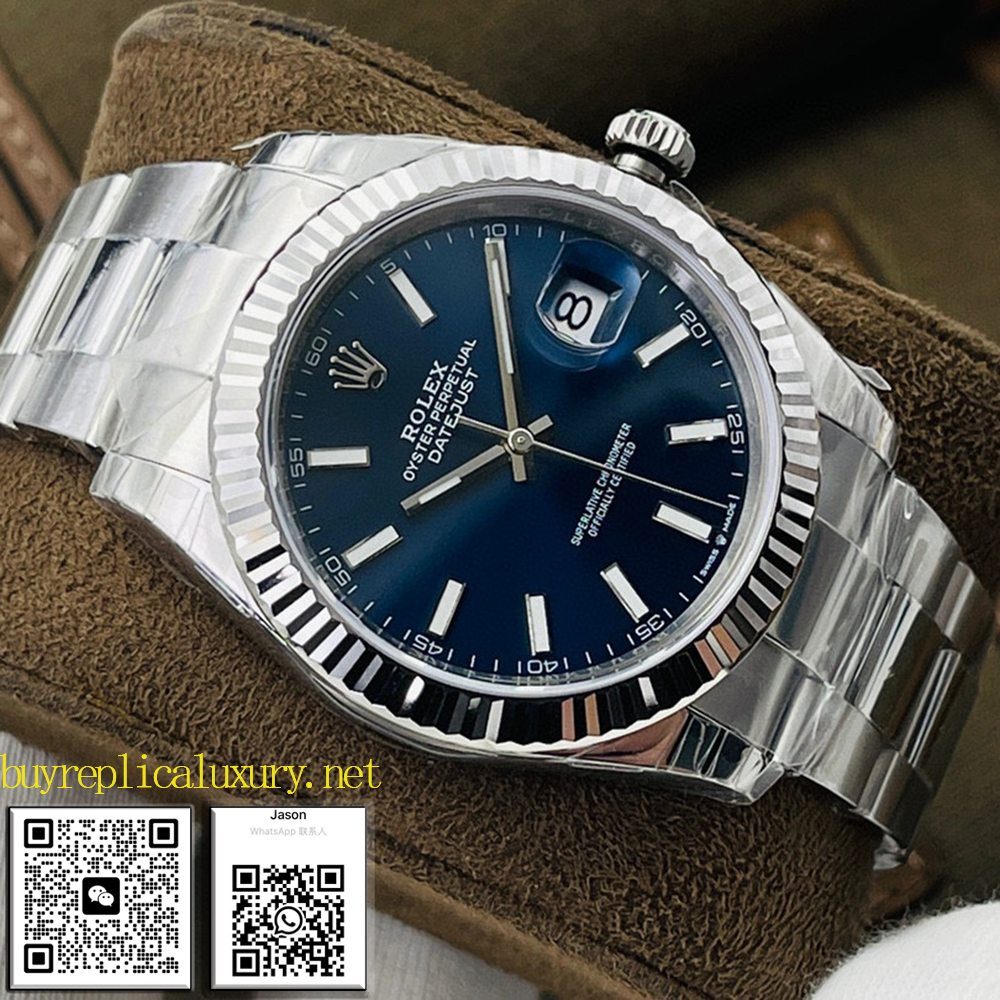 롤렉스 41mm 오이스터 퍼페추얼 데이트 모델, 브라이트 블루 다이얼. 롤렉스 데이트저스트는 1945년 롤렉스 창립 40주년을 기념하여 출시된 인기 있는 클래식 시계입니다. 다이얼에 날짜 디스플레이를 장착한 최초의 손목시계입니다. 데이트저스트는 정장과 캐주얼 모두에 적합한 다용도 시계로 디자인되었습니다. 밝은 파란색 다이얼의 가짜 롤렉스와 진품 롤렉스를 비교해보세요.