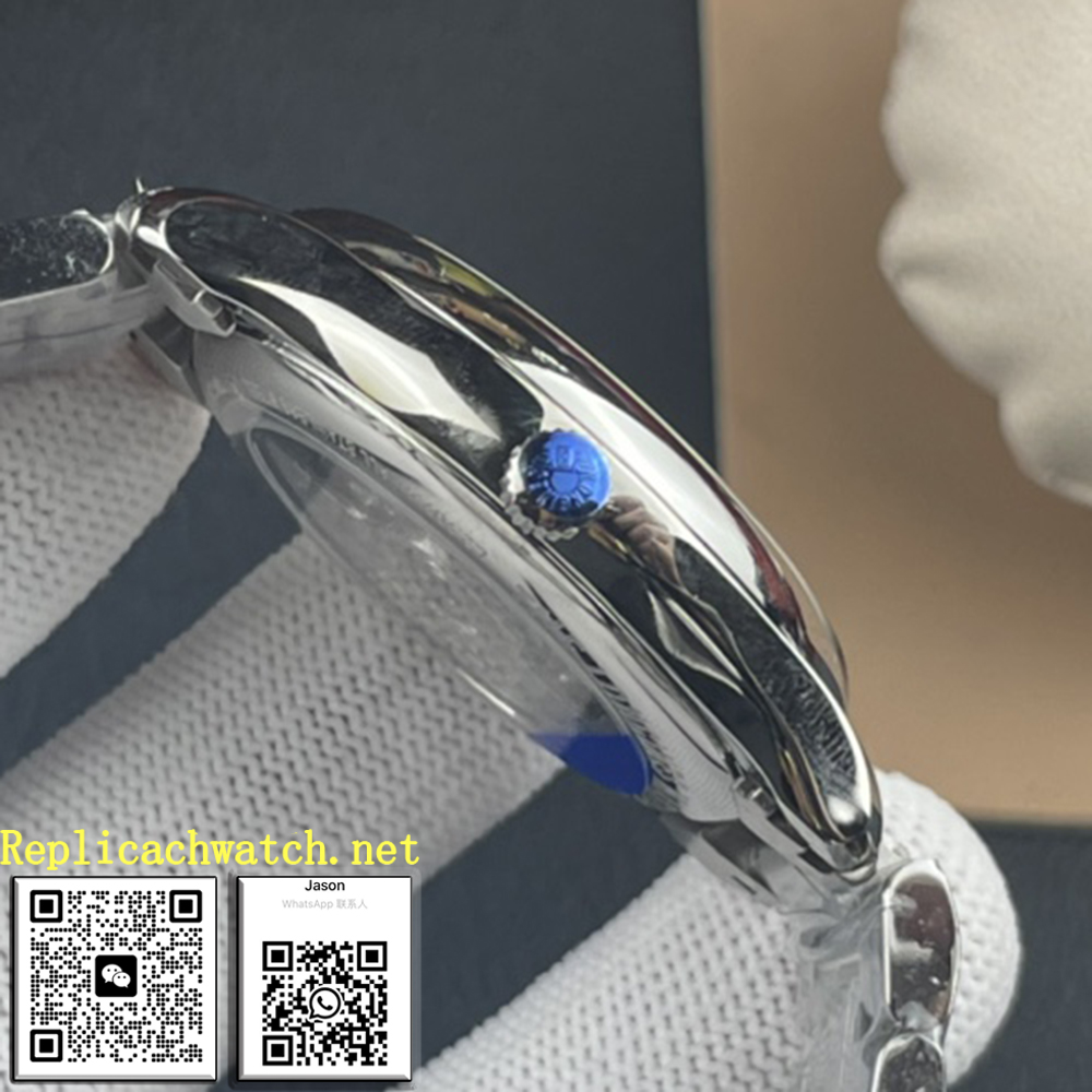 The silver barleycorn guilloché dial serves as a magnificent canvas for the watch’s multiple complications, creating a stunning visual depth that changes with the light. The moonphase display at 6 o’clock features an intricately detailed lunar disc against a deep blue starry sky, while the perfectly proportioned sub-dials display the date, day, month, and 24-hour time. Blued steel hands and applied Roman numerals enhance legibility while adding to the dial’s classical elegance, creating a harmonious balance between functionality and aesthetic appeal.
