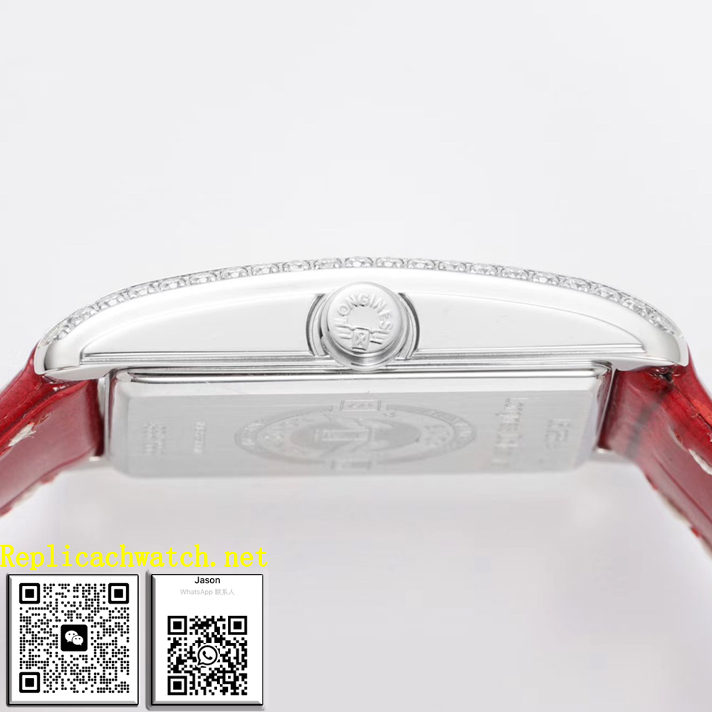 The DolceVita’s design showcases perfect harmony through its balanced rectangular case and delicate proportions. The mother of pearl or champagne dials feature applied Roman numerals and diamond hour markers (in select models), creating a luxurious play of light from every angle. The sleek case lines flow seamlessly into the integrated bracelet, while the iconic Longines fluted crown adds a signature touch of brand identity and refined craftsmanship. Where to buy fake Longines DolceVita Watch? Copy Longines DolceVita Watch Quartz Ladies online.
