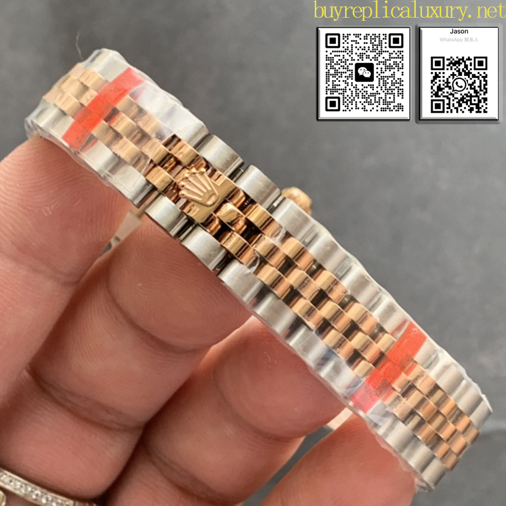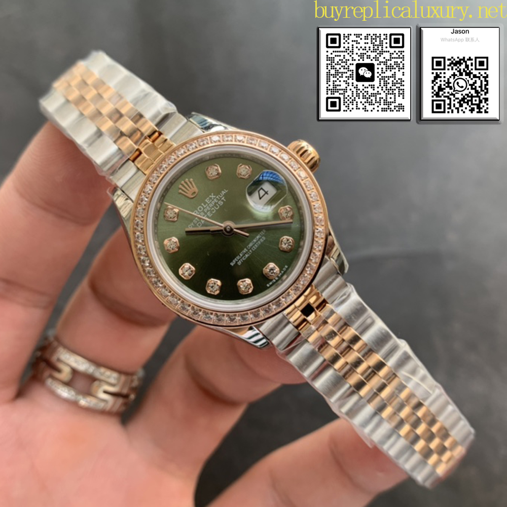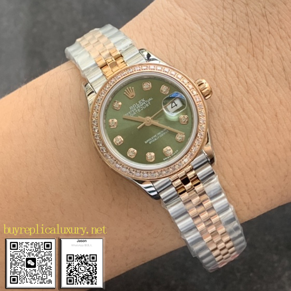 Olive Green Dial: A Display of Exquisite Watchmaking Skills: The distinctive olive green dial of this watch is a testament to Rolex’s exceptional watchmaking expertise. Set in 18K gold, the dial juxtaposes the glittering diamonds, creating a stunning visual contrast and underscoring the watch’s elegance and luxury. The sunray finish, a hallmark of the Oyster collection, is perfectly captured on this olive green dial. This sunray effect creates a subtle and captivating sheen, achieved through exceptional brushing techniques. Through meticulous craftsmanship, artisans meticulously create microscopic grooves radiating outward from the center of the dial. These grooves disperse light, creating a subtle and unique visual effect. As the wearer’s wrist swings, the dial exhibits varying shades of luster, reminiscent of an olive leaf shimmering in the sun, brimming with vitality and beauty. Following the sunray effect, the dial is then tinted an olive green using physical vapor deposition or electroplating techniques, and finally finished with a varnish, perfecting the entire surface and exuding elegance and unique character. Buy fake Rolex Lady Datejust, Rolex Lady Datejust watch fake.